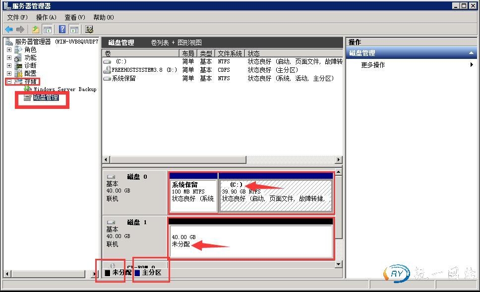 第二步:点击存储找到磁盘管理,我们可以看到系统中只有一个磁盘C,蓝色表示装好的磁盘,黑色表示未划分的空间。