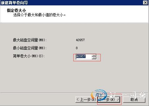 第四步:划分磁盘空间大小如果你只划分一个就默认大小就可以,如果是三个或多个,你可以计算每个磁盘空间大小来划分,太小就没必要了。