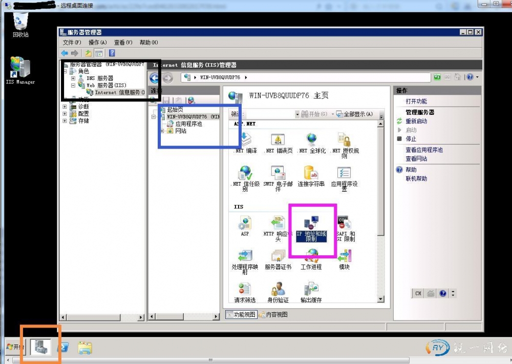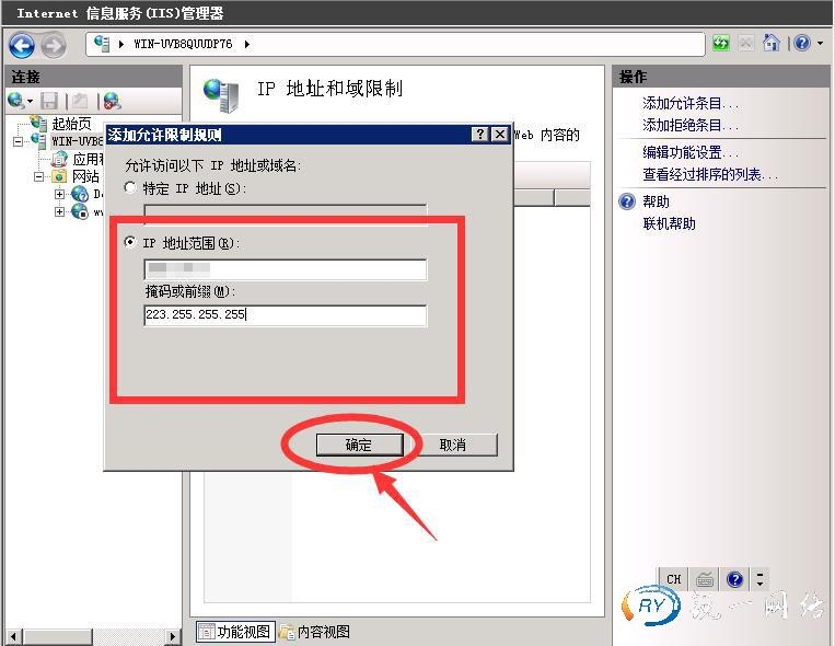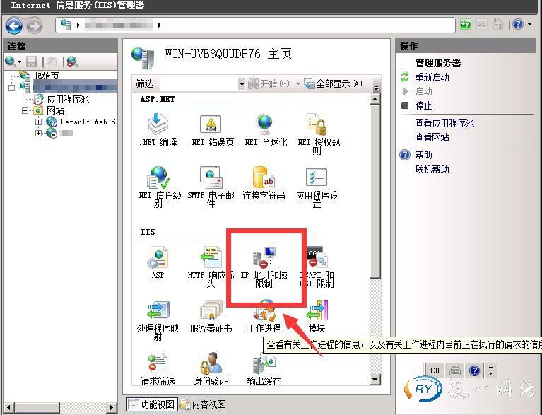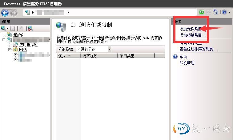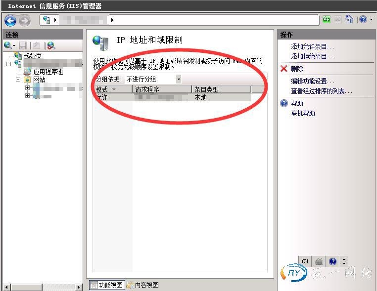 首先你现确认你的IIS是否安装了IP和域限制的"角色服务"这个模块,如果有安装,那么我们依照教程就可直接设置,如果没有,那就可以看看我们如何安装IP和域限制教程安装完成后就可以再进行设置了。