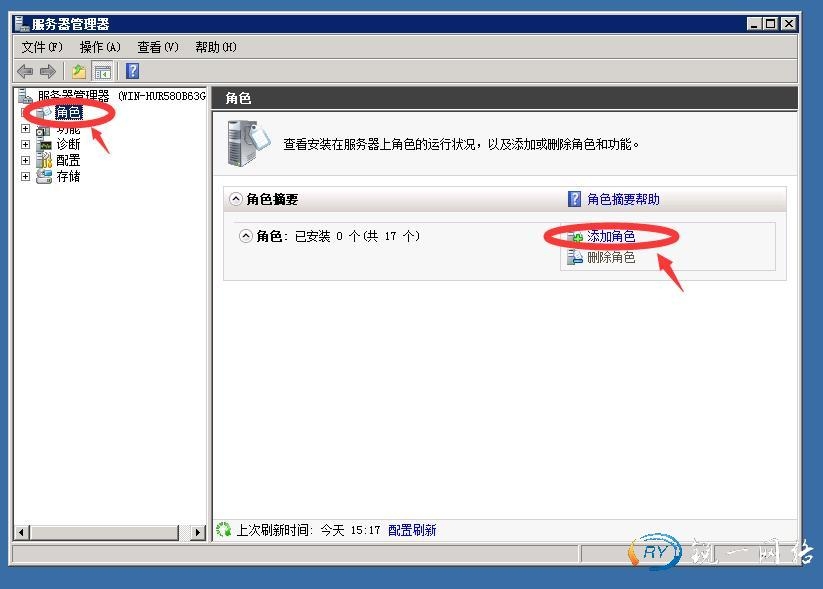 第三步:在服务器管理器中,选择角色选择增加新角色。