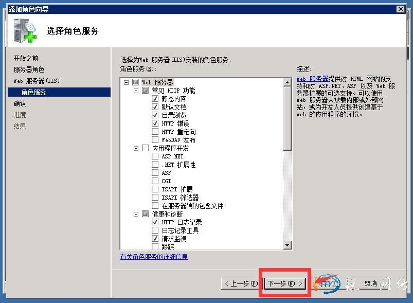 第六步:选择你要安装的角色服务或者直接使用默认设置点击下一步。