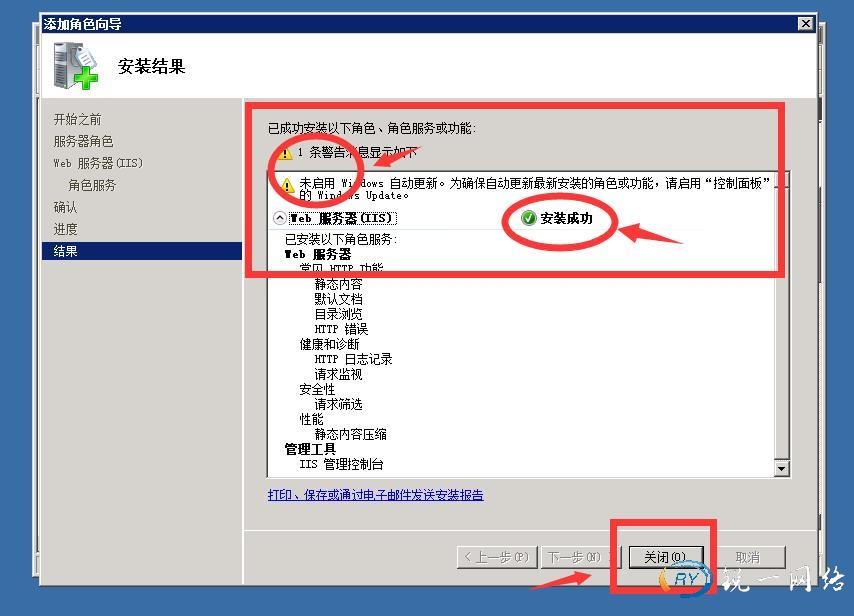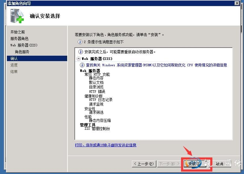 第八步:安装完成后在服务器管理页面可以看到说明已经可以使用IIS了。