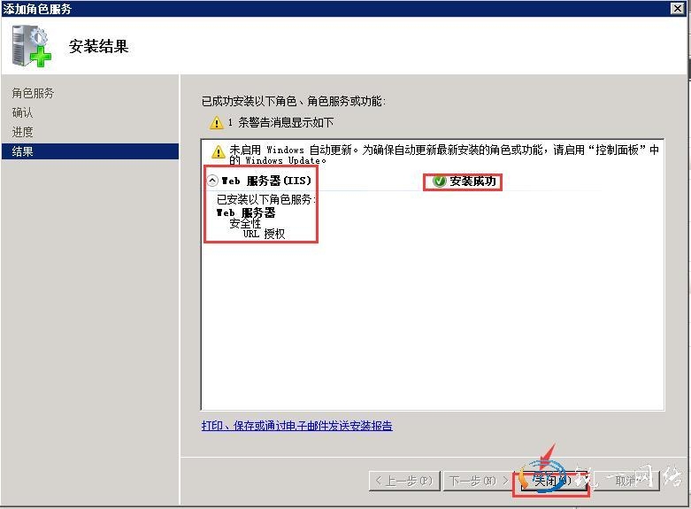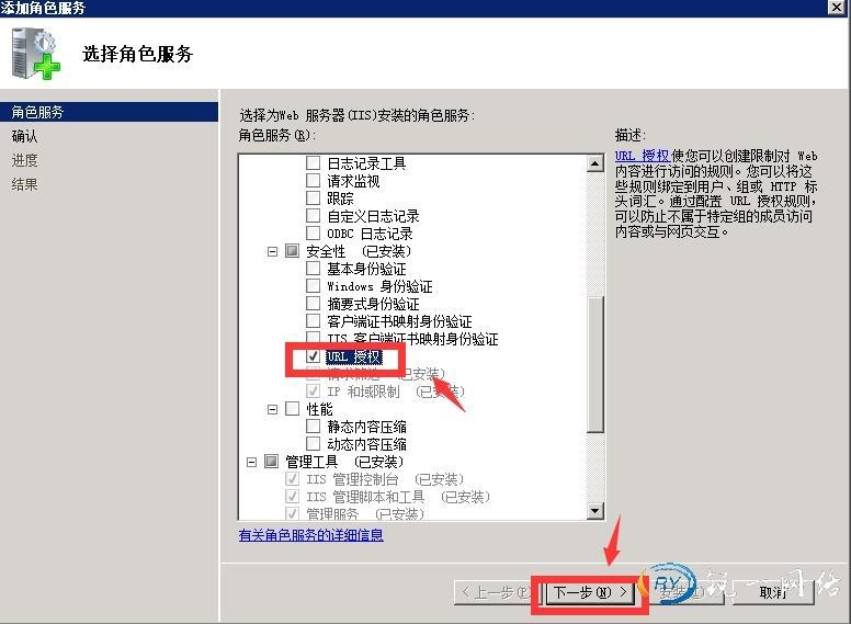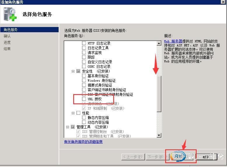 第三步:拉动滚动条找到添加角色服务找到安全勾选框里的URL授权,点击下一步。