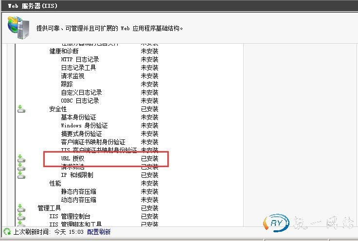 第二步:打开角色—web服务器(IIS)下拉滚动条可以在安全对应框里没有安装URL授权。