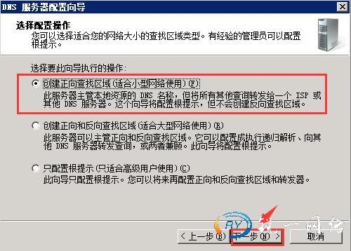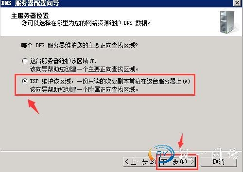 第四步:创建查找区域时,主要看我们的企业类型大小,一般小企业选择第一种就可以了。因为我们是在服务器上的DNS服务器所以选择主服务器位置要选择ISP维护区域组。
