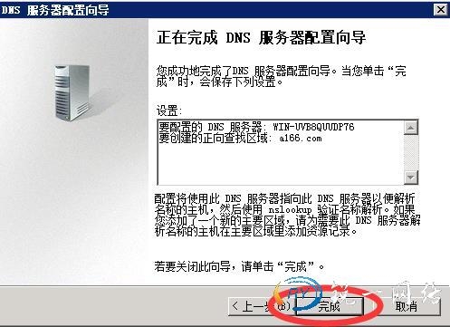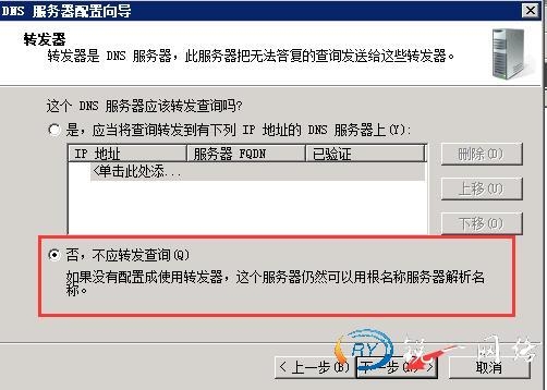 第七步:转发器转发查询设置,这个根据你自己的使用情况来定,或者直接选择否。点击下一步,我们就看大最后完成页面了,点击完成后DNS服务器的基本设置就完成了。如果以后在使用中出现问题,也可以再到这里进行设置。