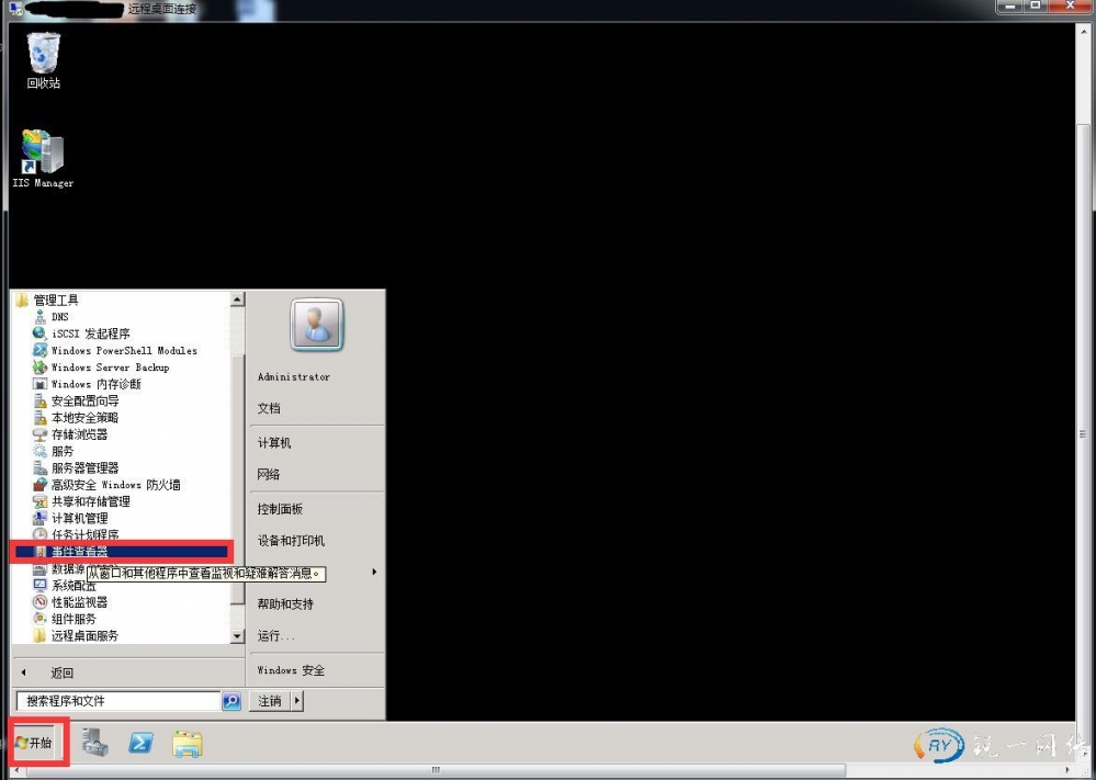 第一步:打开远程桌面的开始菜单,点击管理工具事件查看器。