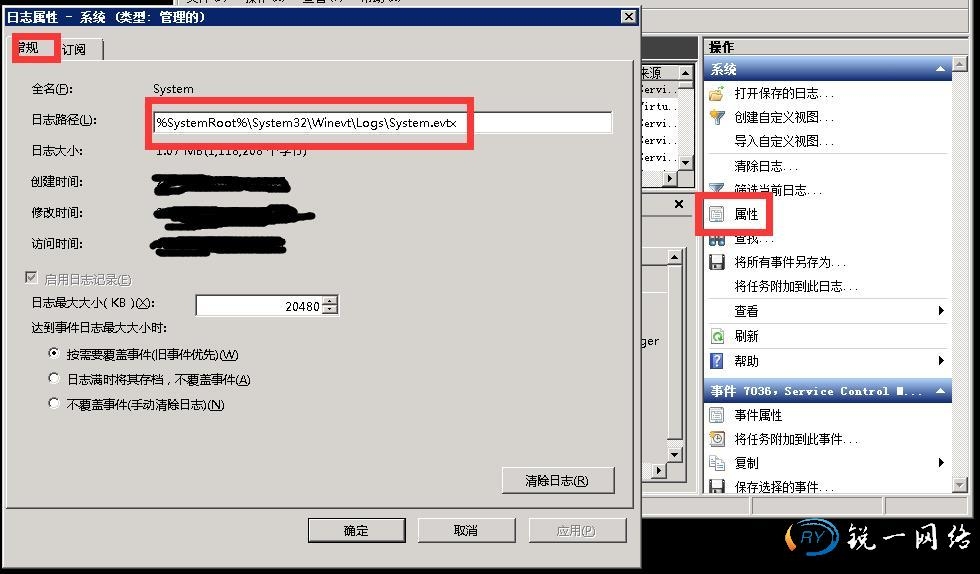 第三步:打开右侧操作栏里的属性进入查看日志所在文件夹。