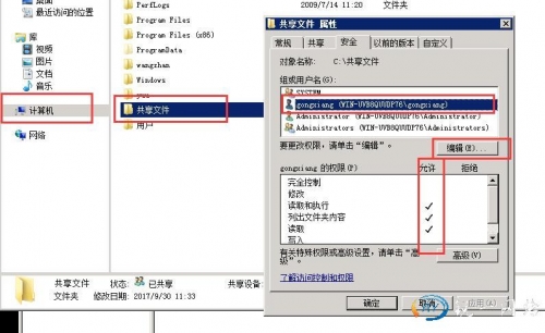 第四步:如果你想要让你的用权限增加。可点击文件的属性—编辑进行设置。如图可以更改权限。这样你的共享文件就可以在局域网中登录使用共享文件了。