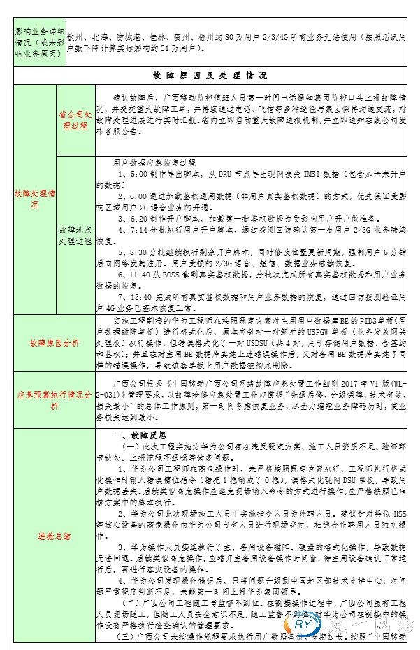 此次故障的影响可以说非常大,广西的钦州、北海、防城港、桂林、梧州、贺州等地区80多万移动用户受到影响,已经属于特大重大通信事故。中国移动已经发布声明承认此次故障,华为也已经派出技术人员展开紧急维护。