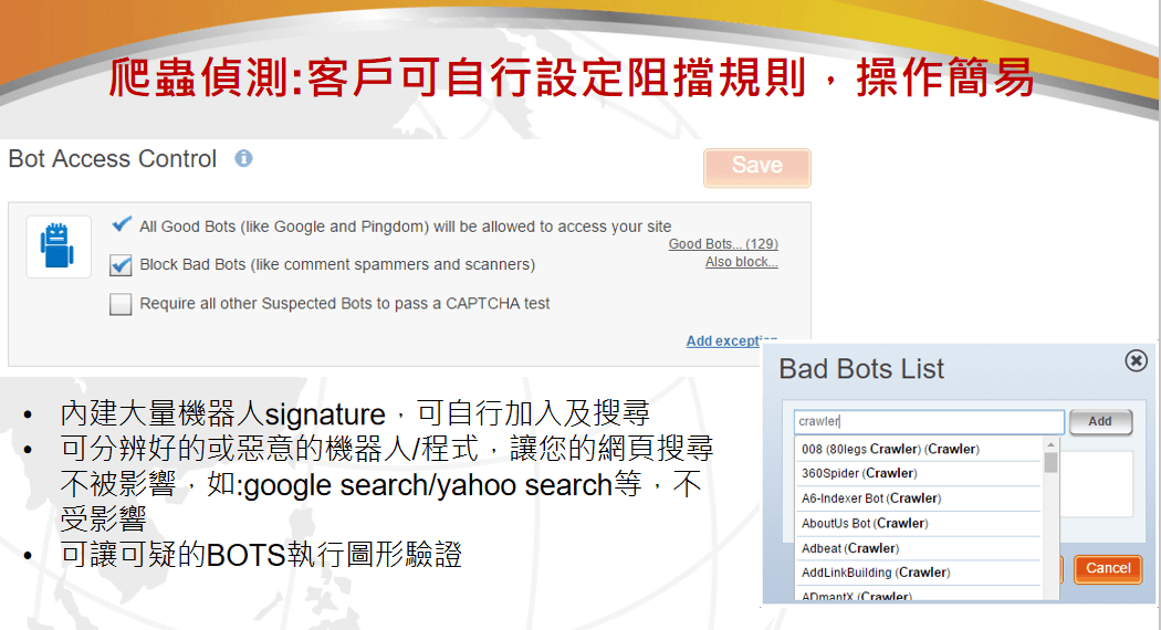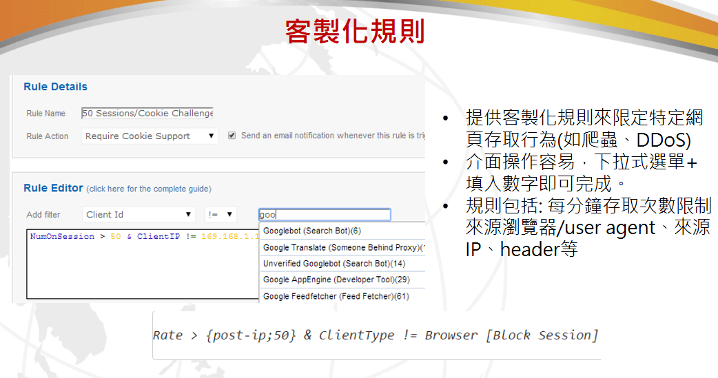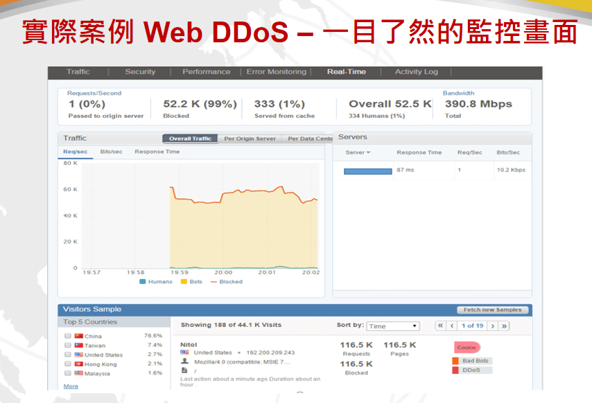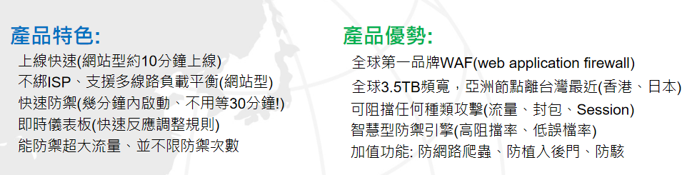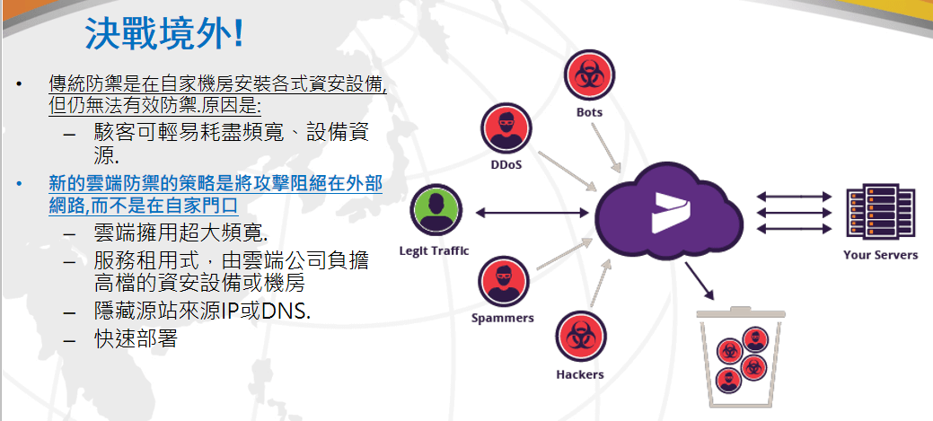 全球云能够在多种应用DDoS攻击发生时保证用户的WEB应用的可用性,从而保证用户的业务持续性。全球云通过低成本的DDoS防御解决方案让用户可以不再考虑在抗击DDoS攻击中所需要的巨额服务供应用商带宽成本问题。通过快速、简单的部署,能够让用户在数分钟之内就完全实现DDoS攻击流量的清洗与迁移。