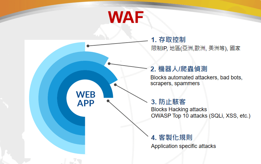 全球云通过为用户提供强大的、灵活的应用安全防御技术,从而为日益增长的计算机攻击防御以及应用分发加速、优化等业务需求提供最佳的解决方案。通过把用户的WEB业务流量路由到全球云的分布于全球网络中的多个数据中心,全球云将所有攻击流量进行清洗,然后将生产流量重新转发至用户的生产服务器,并在处理过程中进行相应的WEB应用加速,从而为所有WEB业务用户提供既安全又快速的WEB应用环境。
